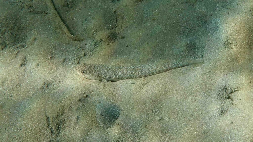 I met two species in shallow water (between 0.5 and 3 m depth), the greater weever and the starry weever (also named streaked weever).