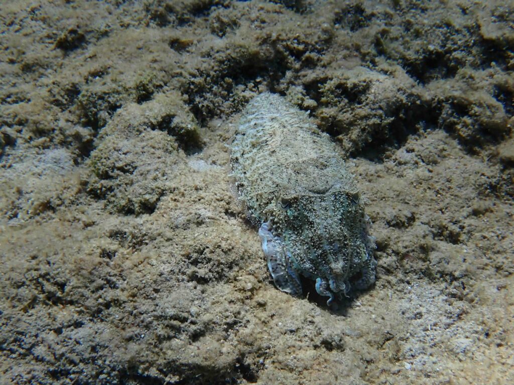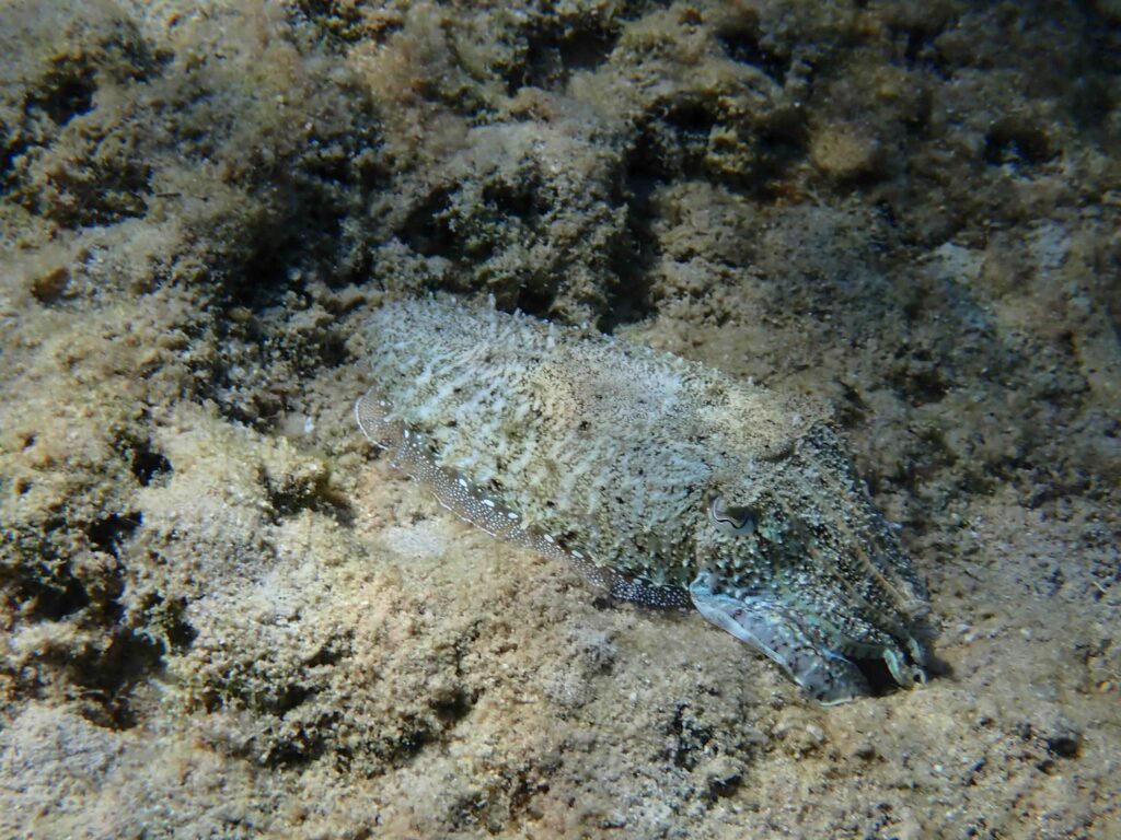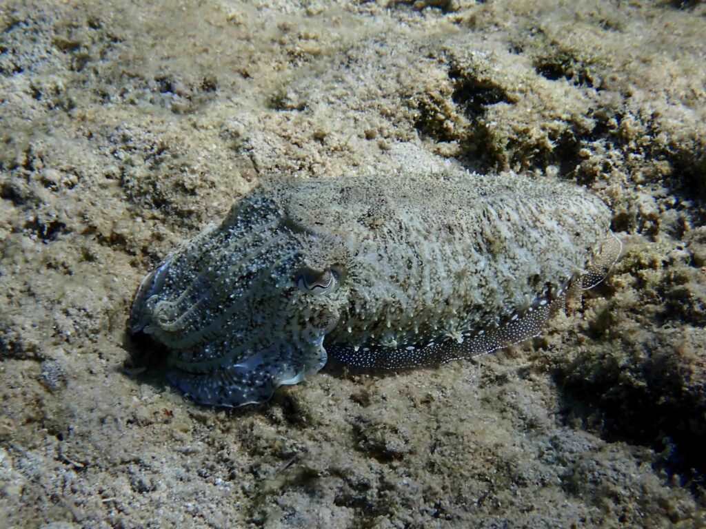 Cuttlefish (as Octopus) are mollusks that belongs to the Cephalopoda (from the Greek plural: κεφαλόποδες, kephalópodes meaning ‘head-feet’). This refers to a particular anatomical feature: the head bears the foot! The foot of cephalopods is modified from the primitive molluscan foot; it forms a set of flexible arms surrounding the mouth. The basic morphological features of cephalopods are presented in the section: ‘Hiding in crevices, overhangs on rocky bottom or among seagrasses’ for the common Octopus. Extant species of cephalopods include nautilus, cuttlefish, squids and octopods.