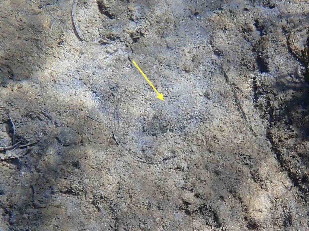 The yellow arrow indicates a wide-eyed flounder (Bothus podas) closely staying next to the weever, presumably waiting for remains of its meal …