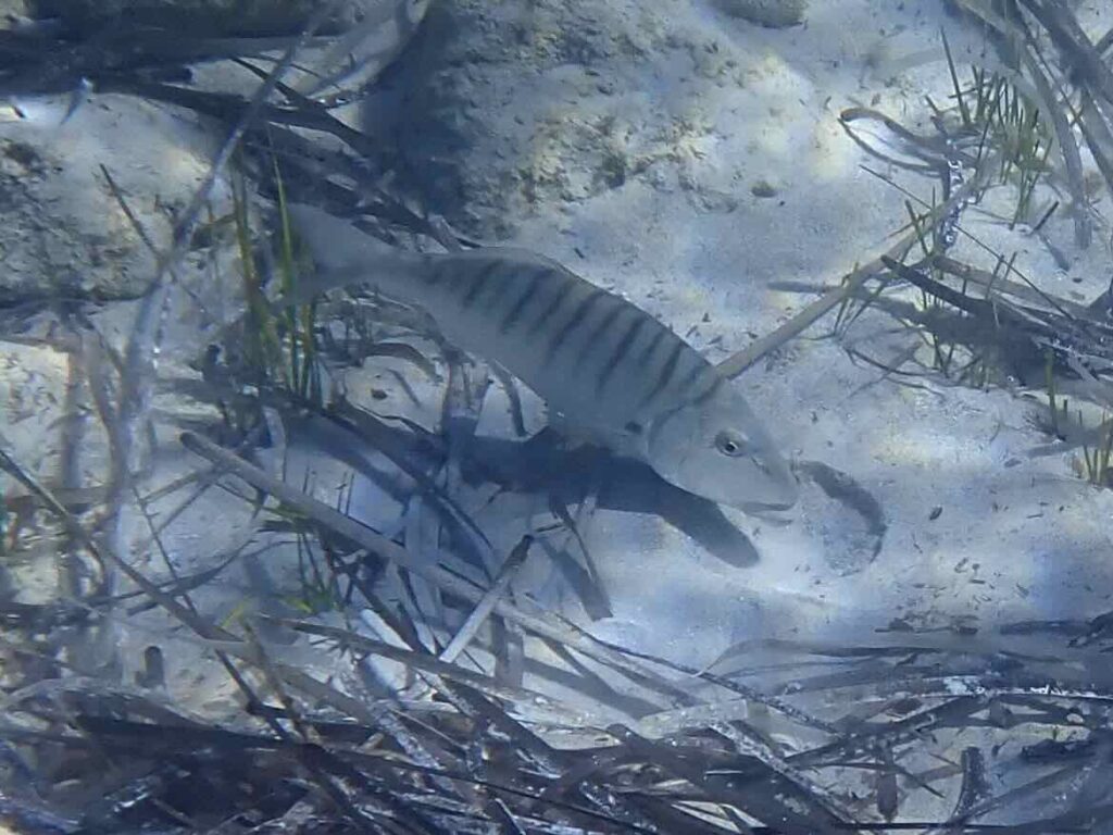The striped mullet is rarely alone! Other fish take advantages of its stirring up activities. They are in its wake or even alongside it, scavenging the preys unearthed from the sand or discarded.