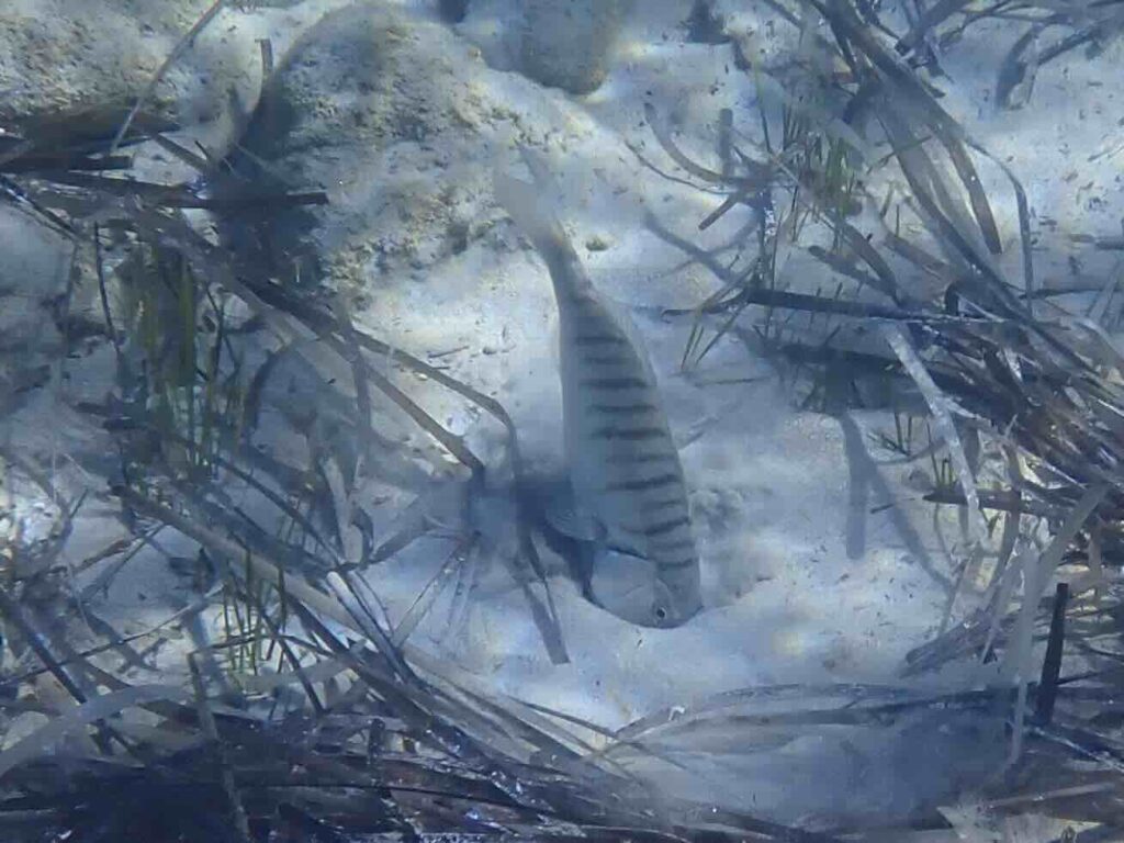 The striped sea bream is a carnivore that digs sediments with its strong snout to capture worms, crustaceans, mollusks, sea urchins (infauna). It leaves typical cup – like depressions all over its prospected area.