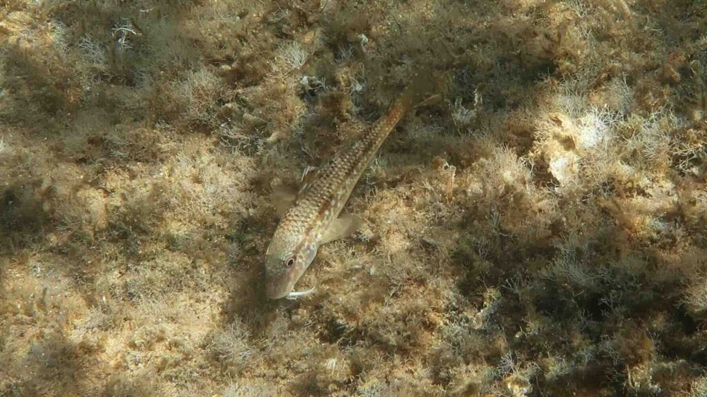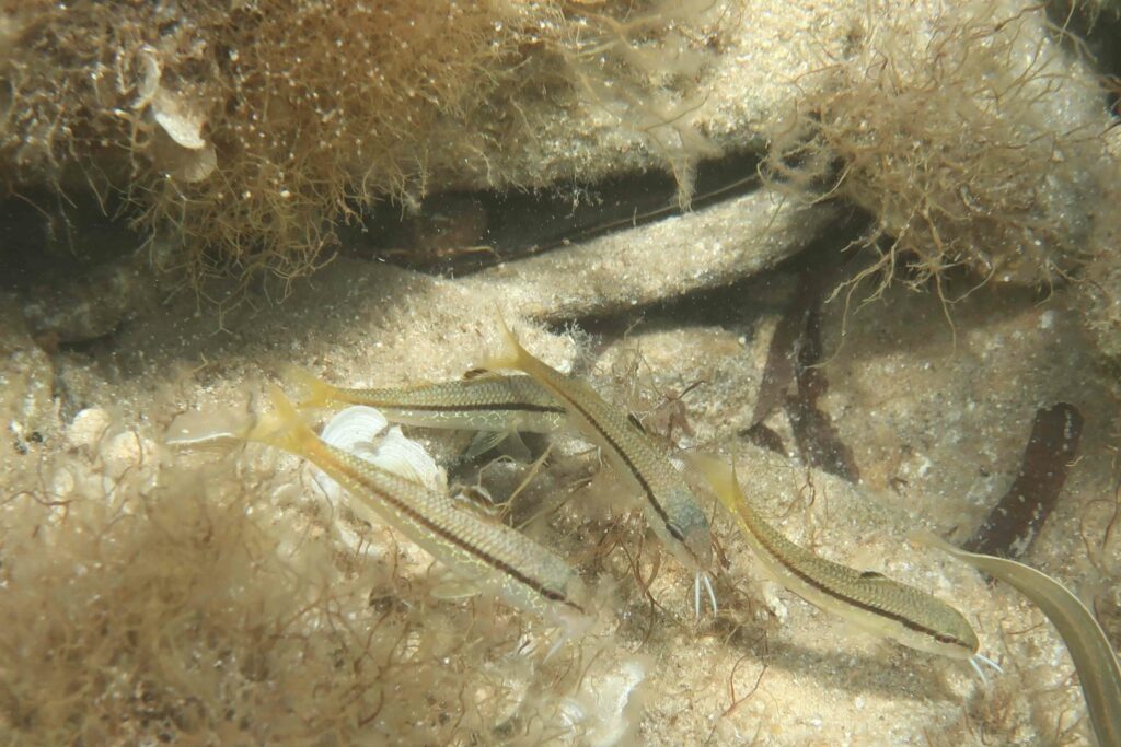 Habit… and association. The striped mullet is frequently seen on soft sediment (sand, gravels, mud), on rocks colonized by algae and invertebrates, or on sediments patches between rocks or in sea-grasses beds. It probes the surface of the substrate, actively stirring up sand or mud with its two chin barbels to dislodge preys (worms, small mollusks, and crustaceans). The chin barbels also serve as sensory organs detecting preys.