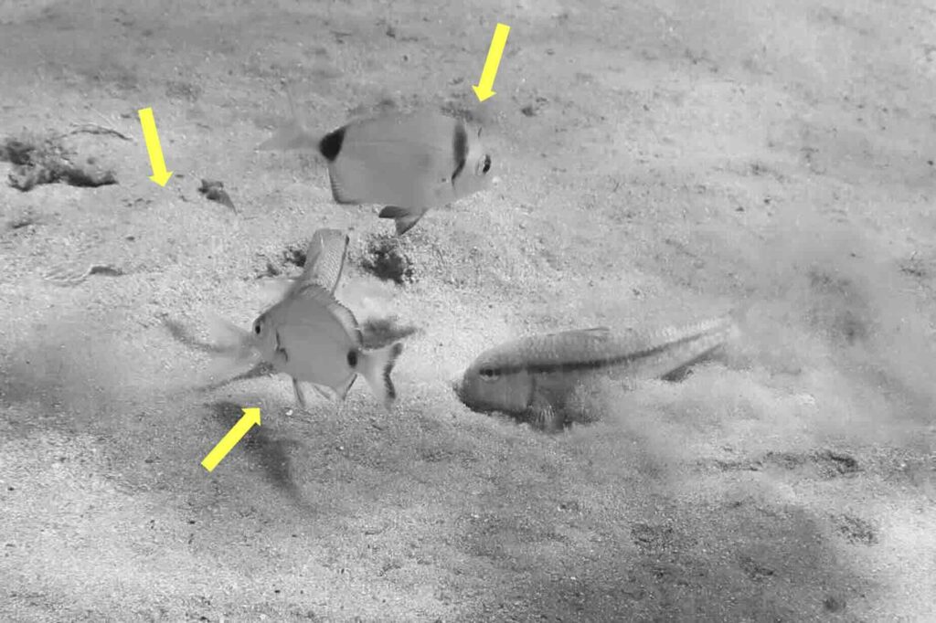 Other species of fishes may swim close to the stripe seabream trying to benefit from dislodged preys.