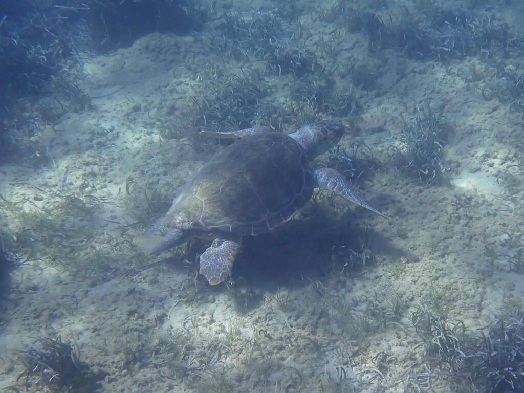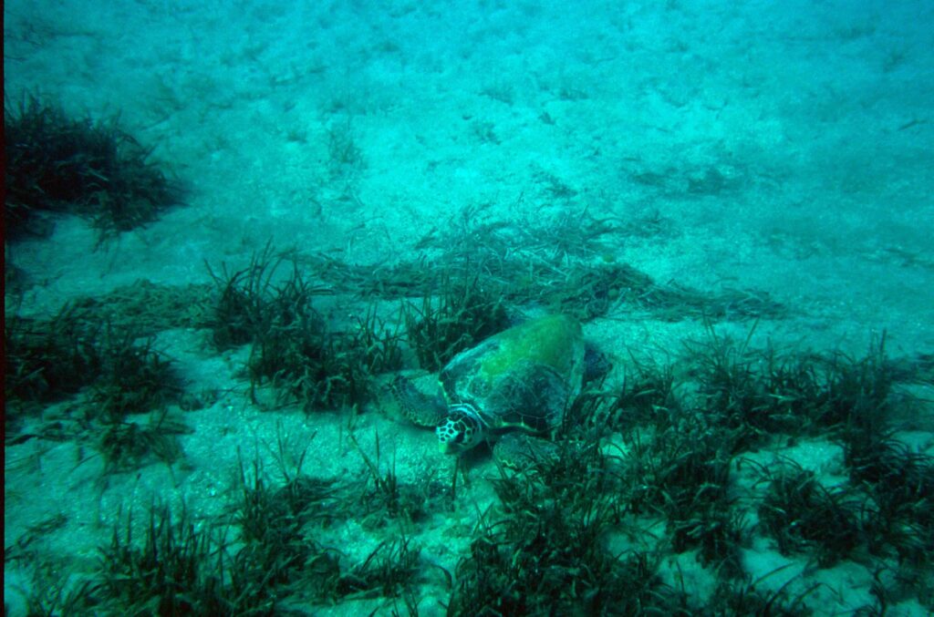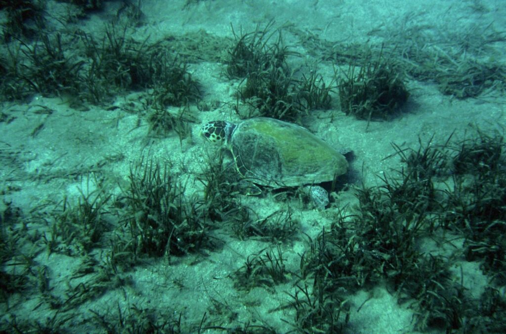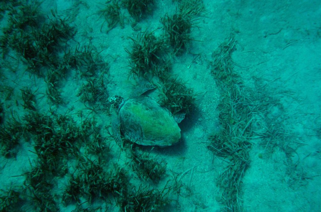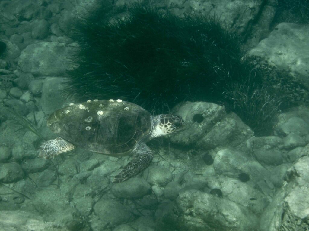 The three following pictures were taken at Agios Georgios (East side, facing Cape Koutsouros), in July 2003 (NIKONOS II film camera). The sea turtle (80-90 cm long) was resting on the bottom at a depth of ca. 6 – 7 m. Several minutes later, when I left the place, it was still there .