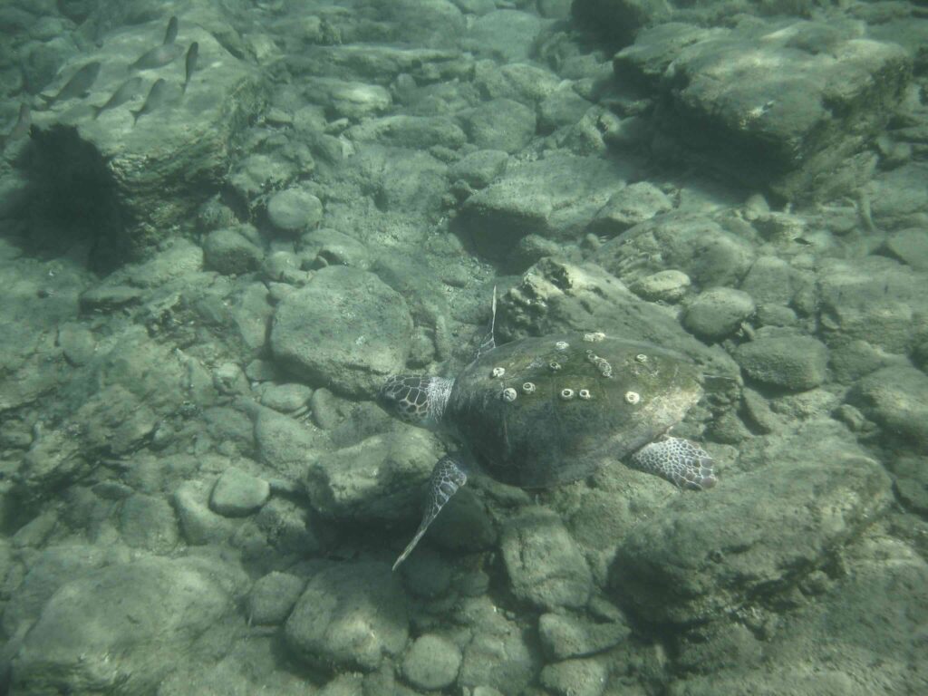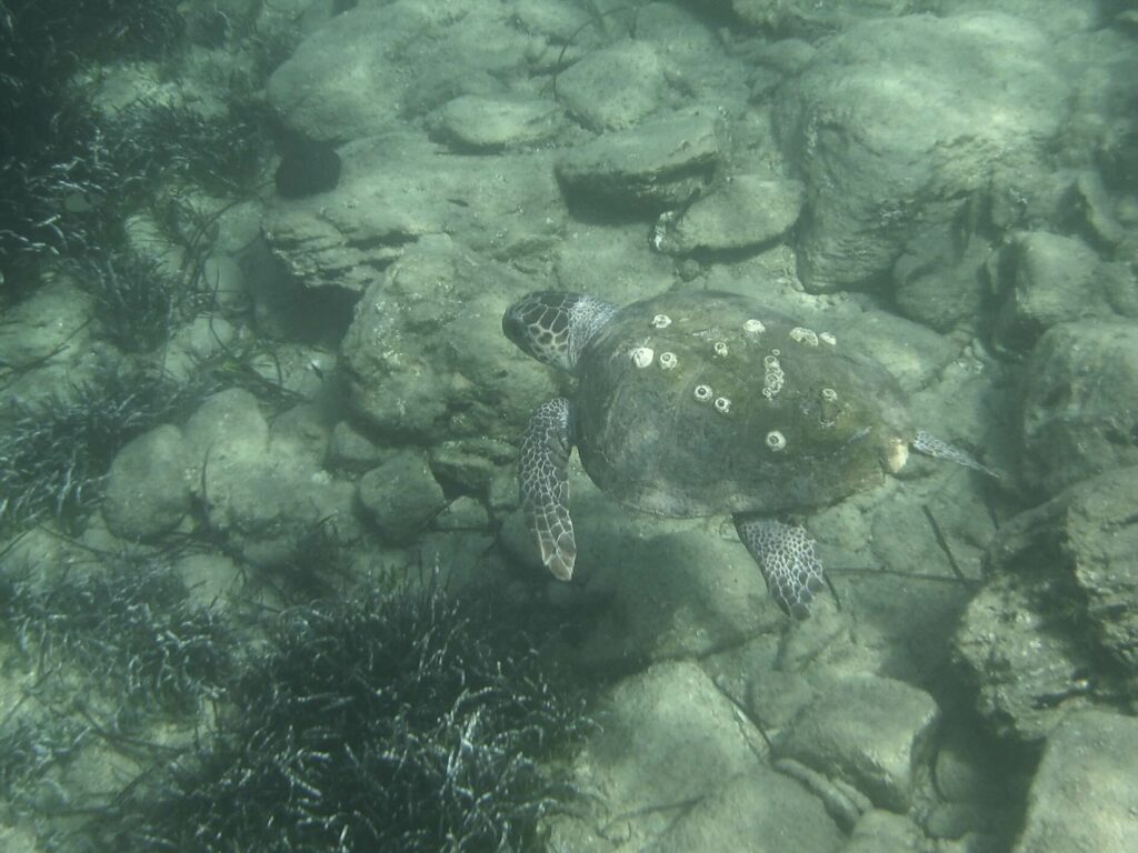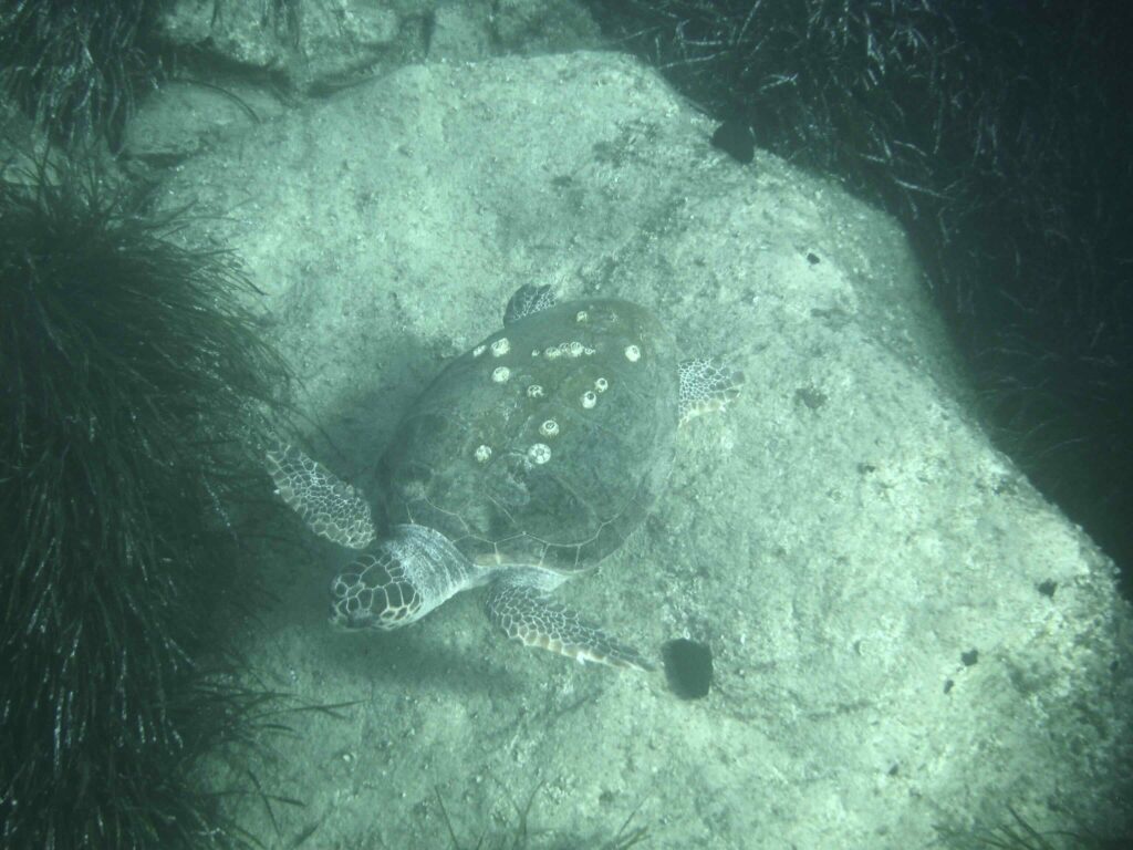The four following pictures were taken in July 2015 – South of Kato Fyra (Canon digital camera IXUS 850 IS). The sea turtle (ca. 50 cm long) was staying close for a long time, swimming peacefully over the bottom (3-4 m deep) and from time to time towards the surface. I was motionless for 10 min, and the turtle seemingly ignored me. The white ‘spots’ on the carapace are barnacles.